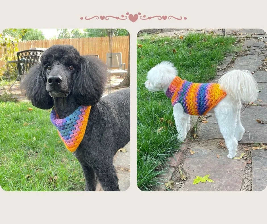 First up is my girl, Pepper 💕. She’s the beautiful poodle modeling the colorful crocheted bandana, and she is the actual gal I named my shop after! Now, you might notice she’s giving the camera a bit of a serious look in her photo. That’s because she absolutely despises having her picture taken, so she always looks a little grumpy when I try to play photographer 😂. Even with the attitude, she’s the best namesake I could ask for.